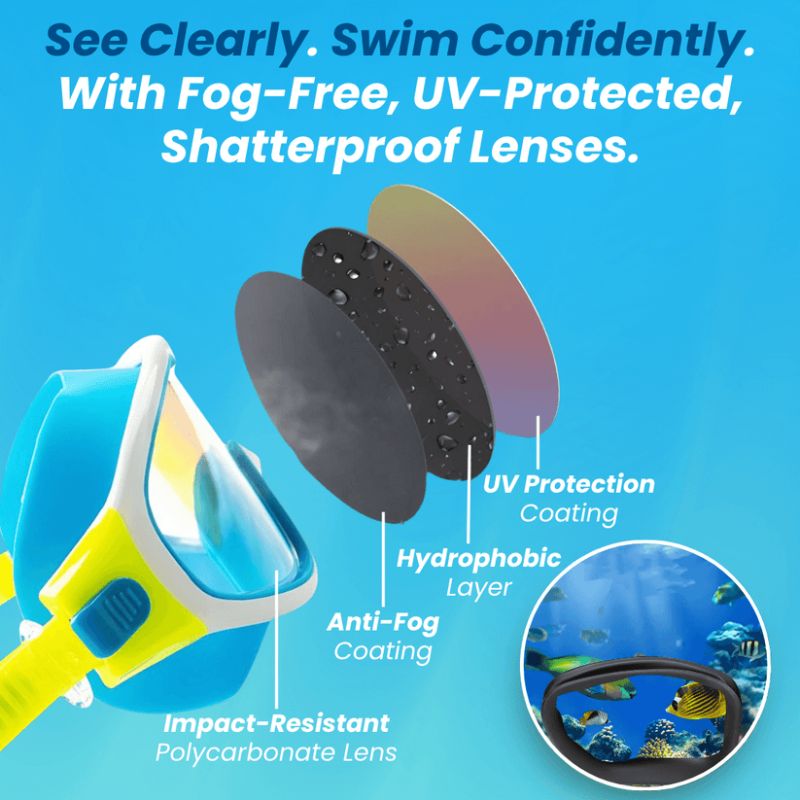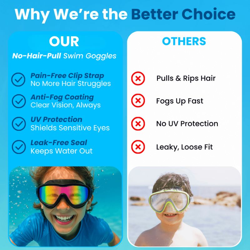 Say goodbye to water sneaking into little ears and noses! Our swim goggles come with a built-in one-piece nose clip and earbuds designed to keep water out and comfort in. Made from skin-friendly, BPA-free, and PVC-free materials, they’re not only eco-friendly but also rigorously tested for safety. No chemicals, no discomfort—just clean, carefree swimming fun for you!